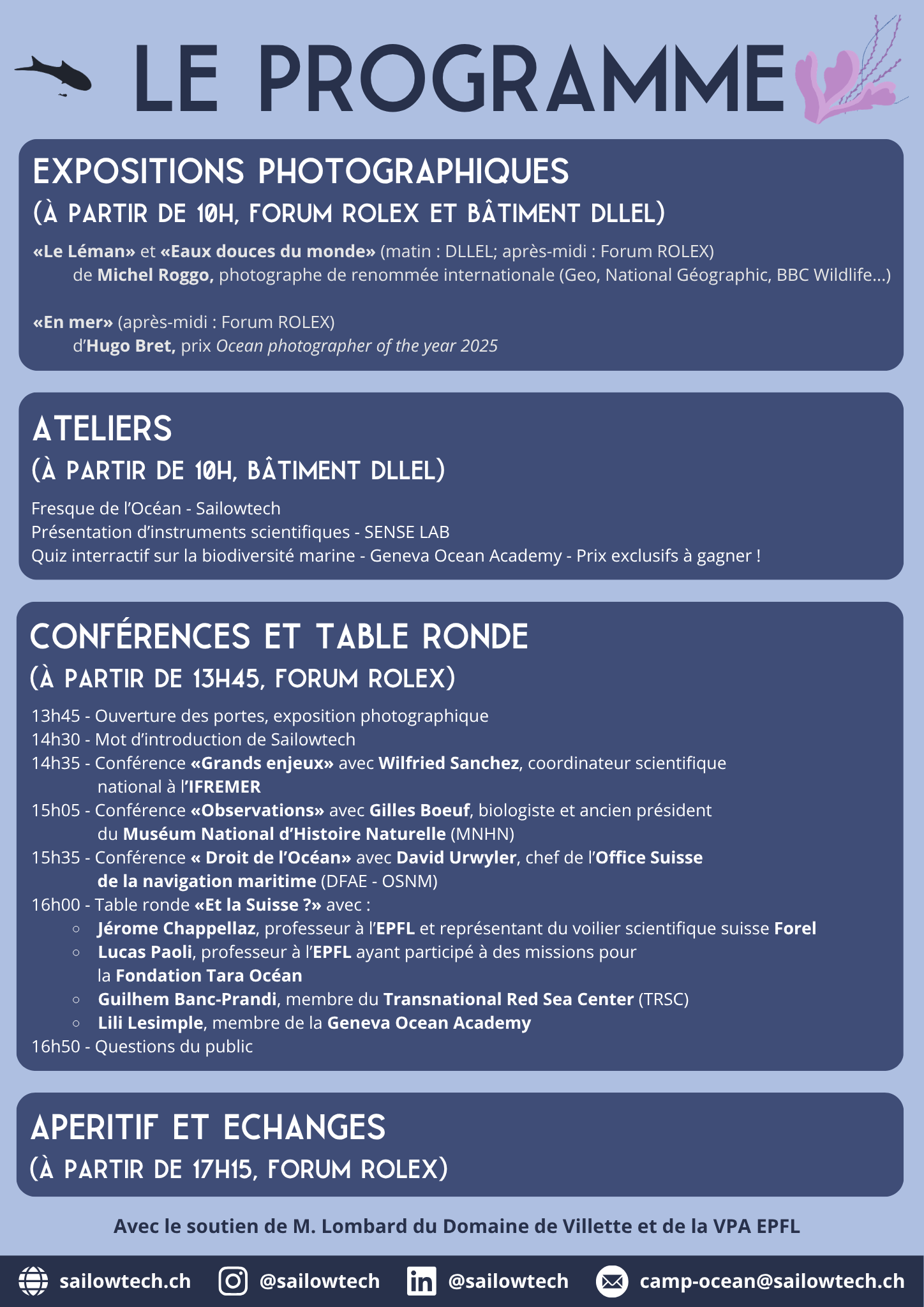 - trois ateliers interactifs orientés action : Fresque de l’Océan, découverte d’instruments scientifiques avec le SenseLab, et quiz sur la biodiversité marine avec la Geneva Ocean Academy (prix à la clé)