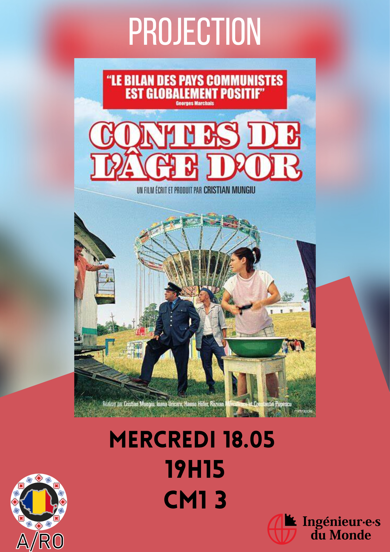 The movie "Tales from the Golden Age" will be projected. This film is composed a several short stories, each set in the late communist period in Romania and based on urban myths that would have allegedly happened under the regime of dictator Nicolae Ceausescu.
