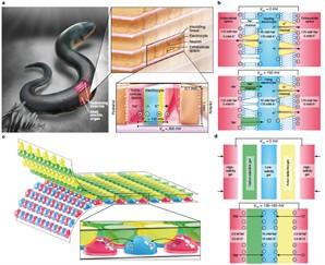 Figure: Electric Organ of the electric “eel” Electrophorus electricus showing so-called electrocyte cells (a) and the ionic transport processes at the membranes of these cells (b). Hydrogel lenses with different salt concentrations and different immobilized charges (c) mimic the electric organ and set up an electric potential difference when they are brought in contact with each other (d).