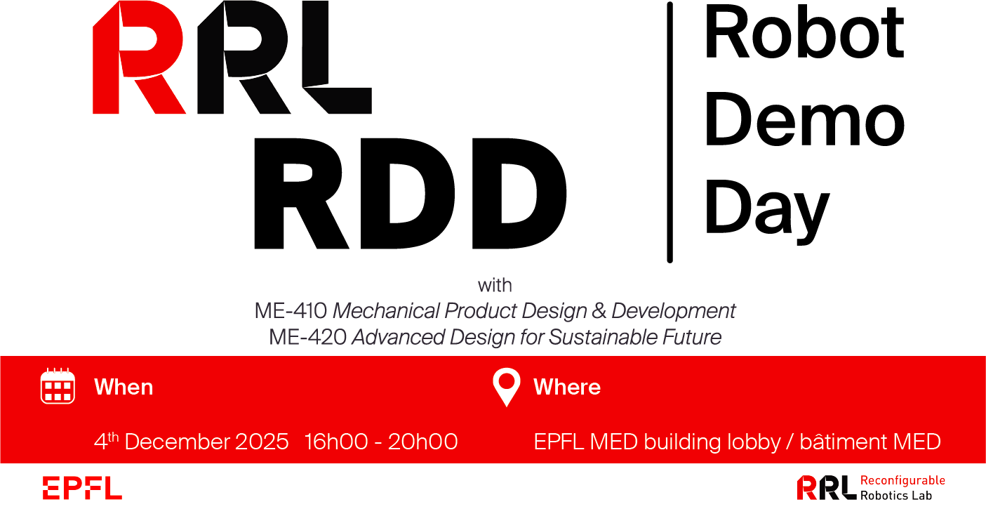 Le RRL a le plaisir de vous inviter à la présentation annuelle des cours ME-410 Mechanical Product Design & Development et ME-420 Advanced Design for Sustainable Future. Nous présenterons des démonstrations en direct de robots portables et de robots durables réalisés par les étudiants diplômés de la classe, ainsi que nos derniers robots reconfigurables du RRL.