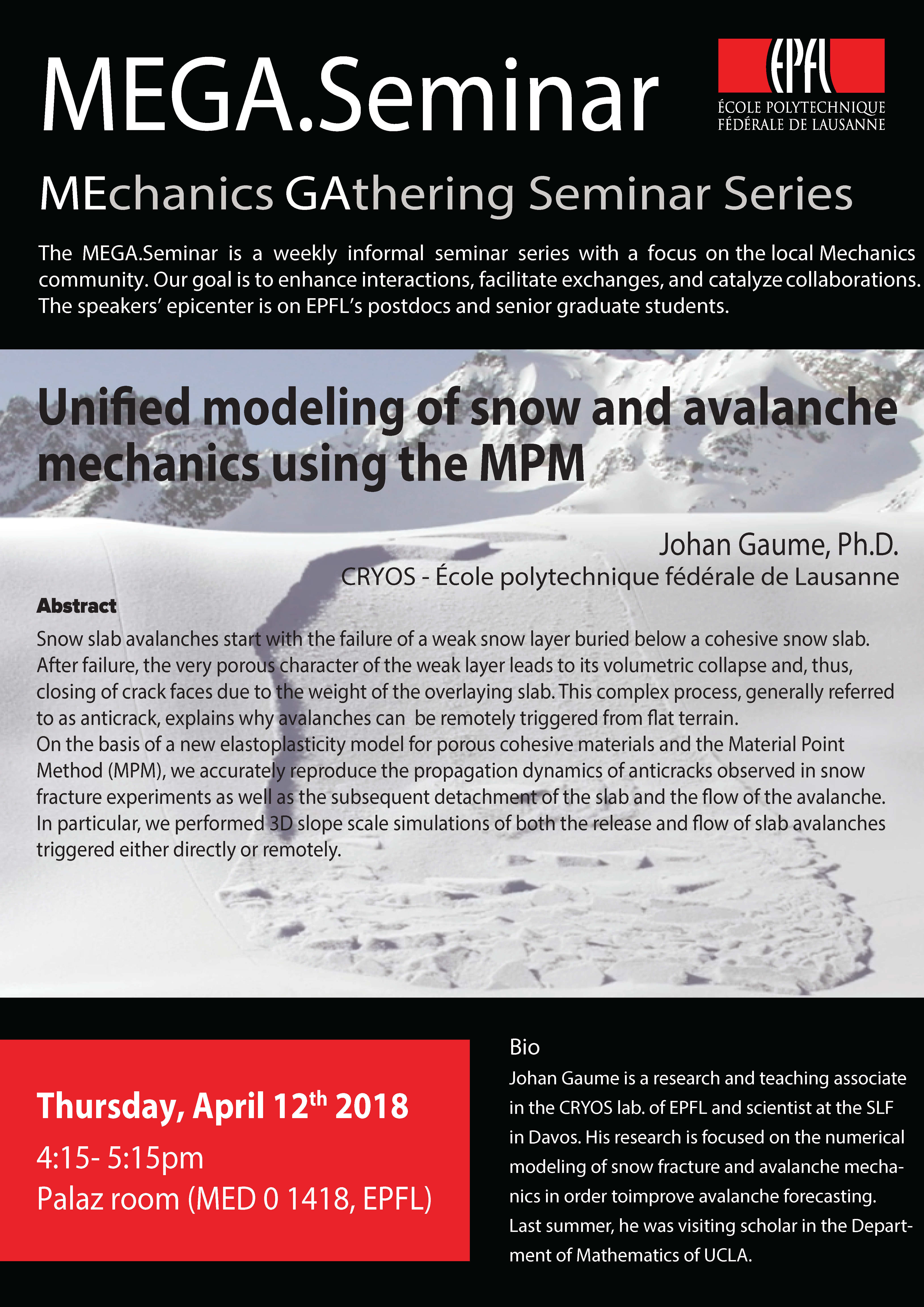 Speaker | Dr. Johan Gaume - EPFL ENAC IIE Laboratory of Cryospheric Sciences (CRYOS) |