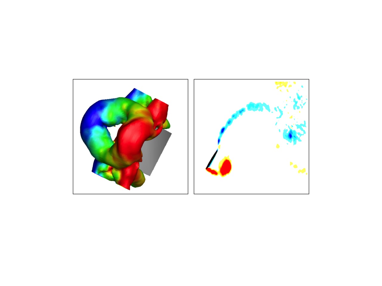 Abstract : The study on vortex formation and unsteady force generation offers insights into understanding the dynamics of flapping found in nature and the performance of novel, bio-inspired energy harvesting systems. First, in order to find the effect of wing aspect ratio on thrust generation, three-dimensional vortex structures are investigated experimentally using a model that mimics the clapping motion of butterfly wings. The strength of the vortex structure generated by the model increases with decreasing aspect ratio, and the inner area enclosed by the vortex structure becomes larger as the aspect ratio is decreased. Hence, in contrast to the traditional aerodynamic theory, the low aspect-ratio wings produce larger thrust than the high aspect-ratio wings in some unsteady modes. In addition, self-excited flapping dynamics and instability are discussed for an inverted flag configuration with a free leading edge and a fixed trailing edge, which reveals quite distinct dynamical behaviors from those of a general flag. This inverted flag configuration was motivated by the tree leaves fluttering in a breeze regardless of their orientation relative to the wind direction. For the flapping inverted flag, the time scale of optimal vortex formation correlates with the energy conversion of fluid kinetic energy to elastic strain energy. Lastly, the energy harvesting performance of a periodically pitching and heaving hydrofoil similar to the flapping fins of aquatic animals is examined. Flow visualization shows that the shedding of the bound vortices critically limits the overall power generation of the hydrofoil while the development of leading-edge vortices contributes to improved efficiency.